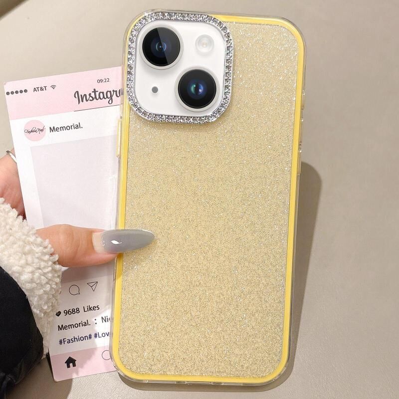 For iPhone 13 Rhinestone-Embedded Camera Frame Glitter Full Coverage Phone Case(Yellow)