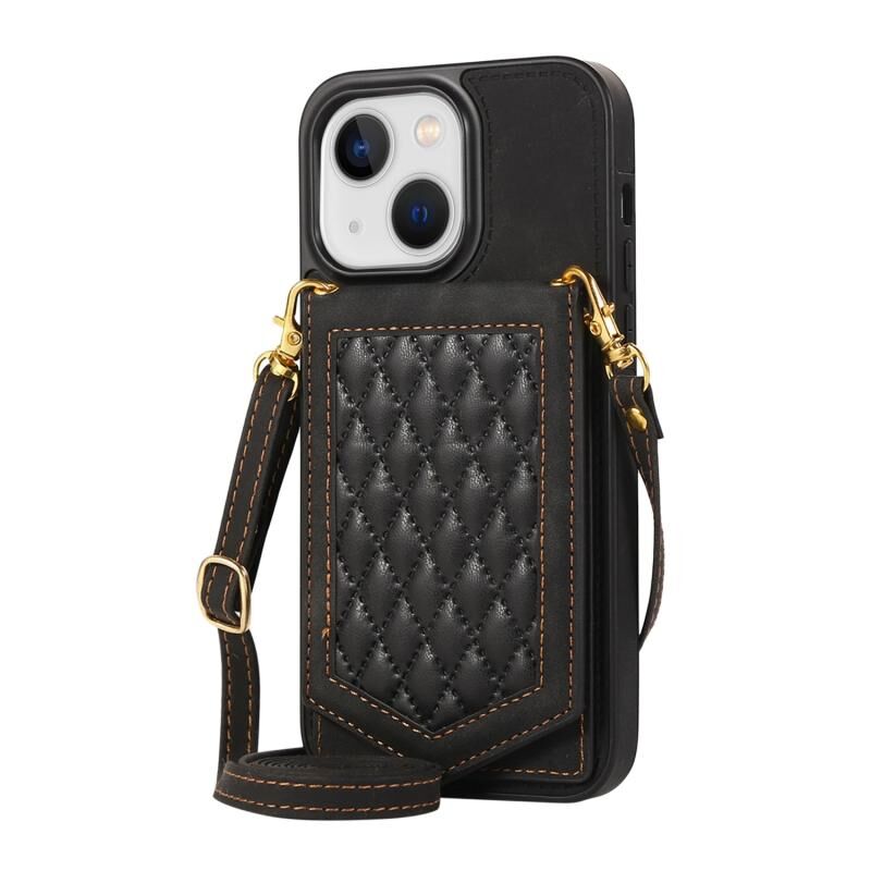 For iPhone 13 Rhombic Texture RFID Phone Case with Lanyard & Mirror(Black)