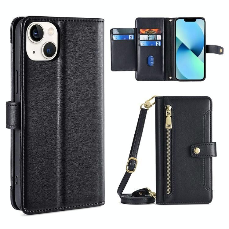 For iPhone 13 Sheep Texture Cross-body Zipper Wallet Leather Phone Case(Black)