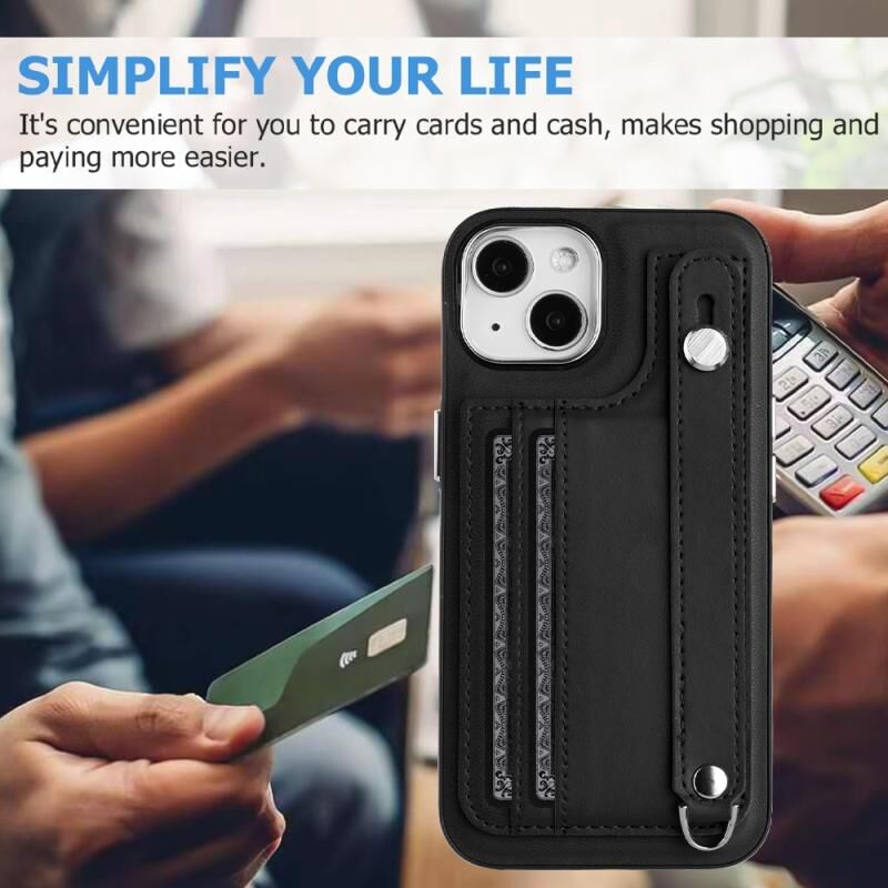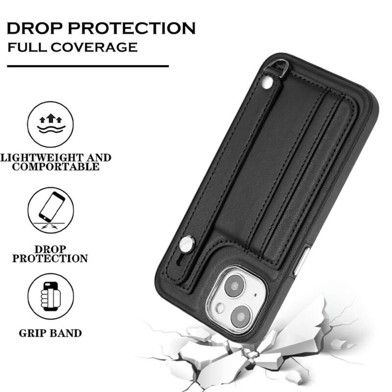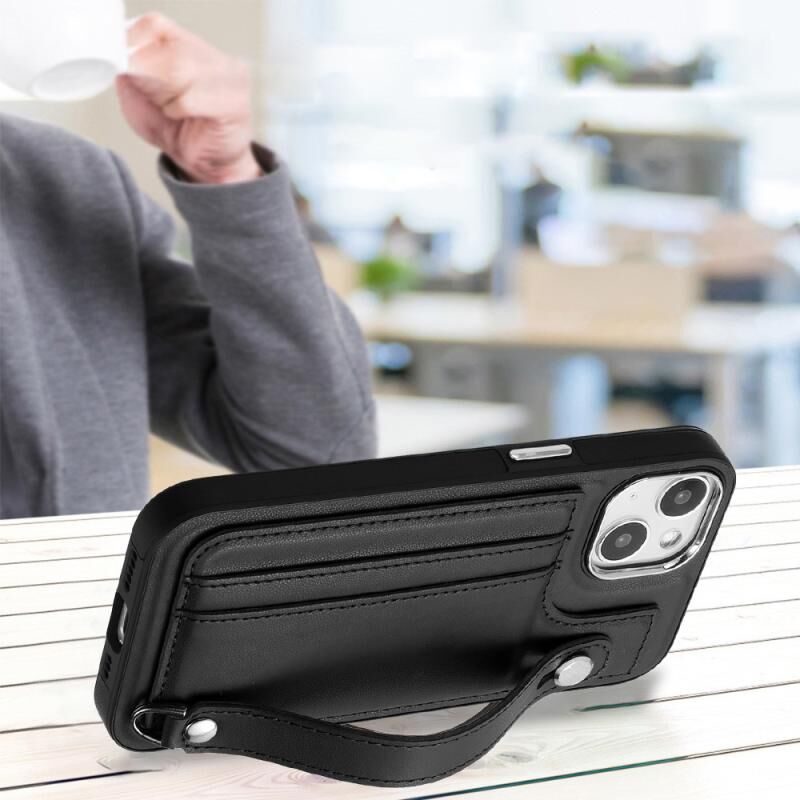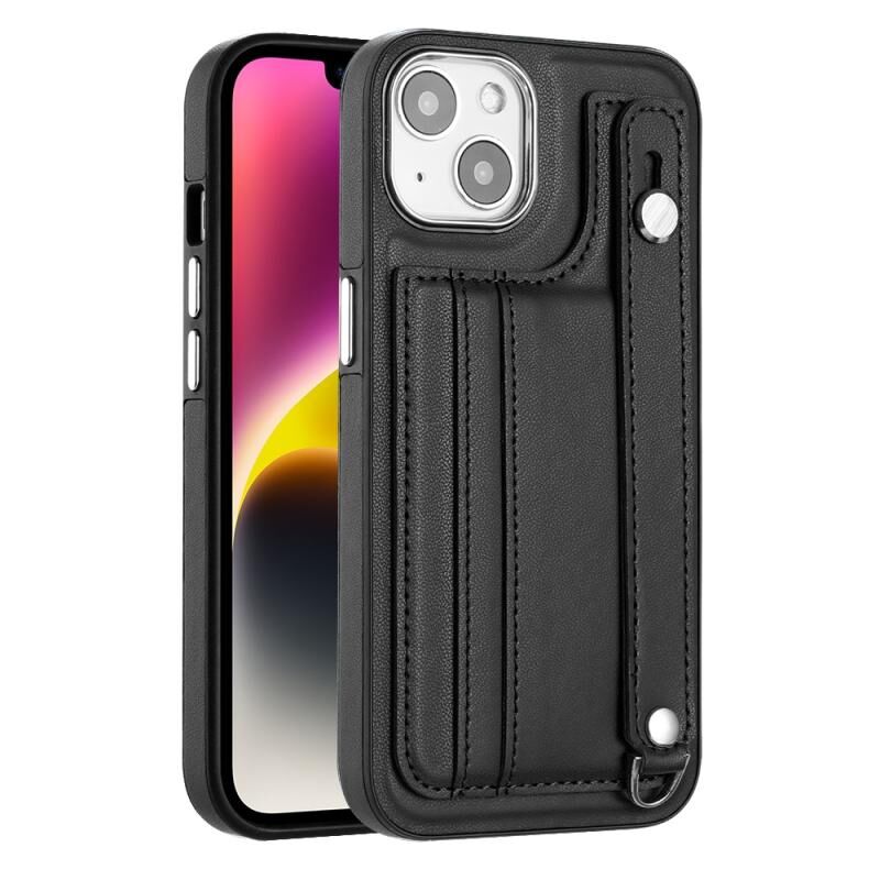For iPhone 13 Shockproof Leather Phone Case with Wrist Strap(Black)