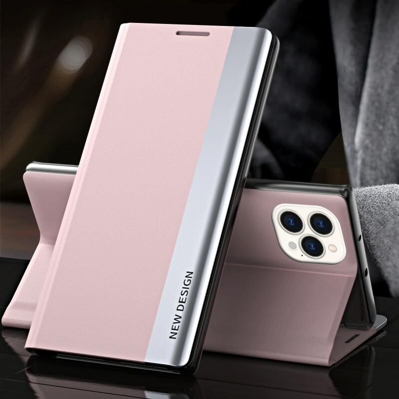Θήκη δέρματος οριζόντιας αναδίπλωσης, εξαιρετικά λεπτή, μαγνητική, με ηλεκτρολυτική επικάλυψη για iPhone 13 με βάση (Ροζ)