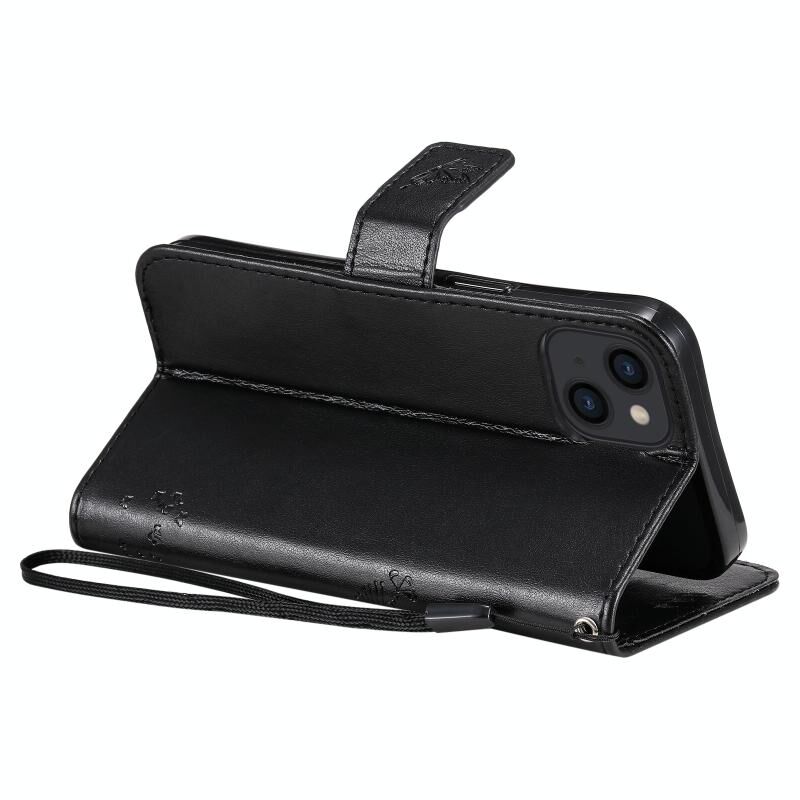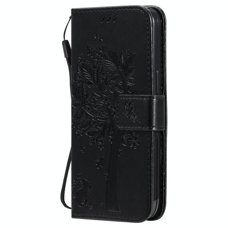 For iPhone 13 Tree & Cat Pattern Pressed Printing Horizontal Flip PU Leather Case with Holder & Card Slots & Wallet & Lanyard(Black)