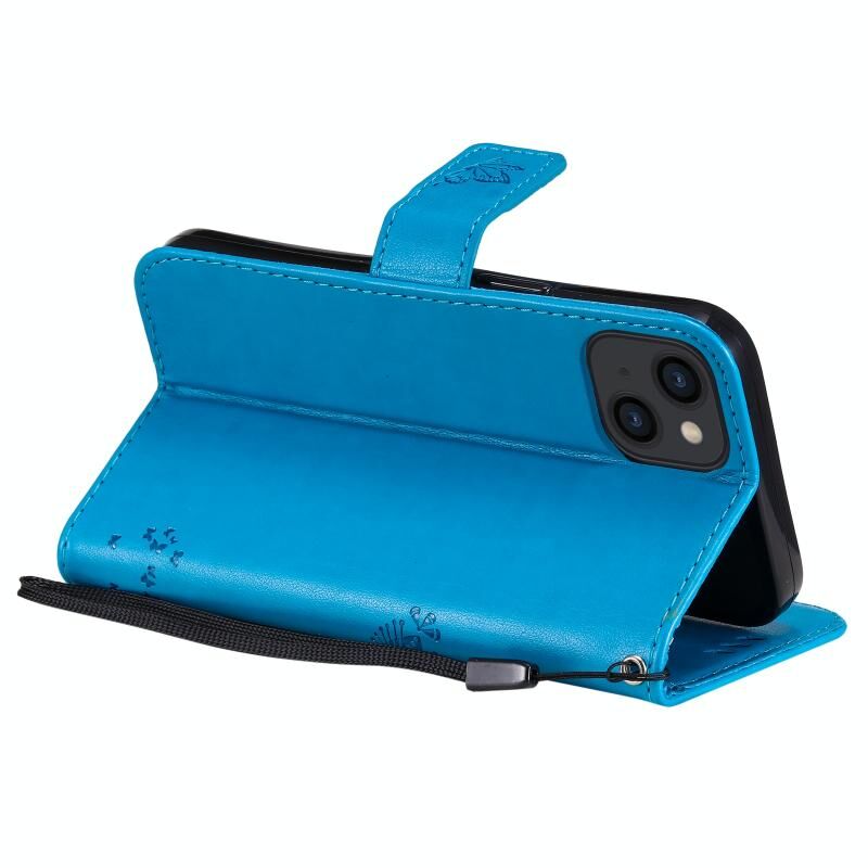 For iPhone 13 Tree & Cat Pattern Pressed Printing Horizontal Flip PU Leather Case with Holder & Card Slots & Wallet & Lanyard(Blue)