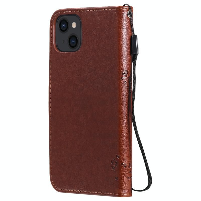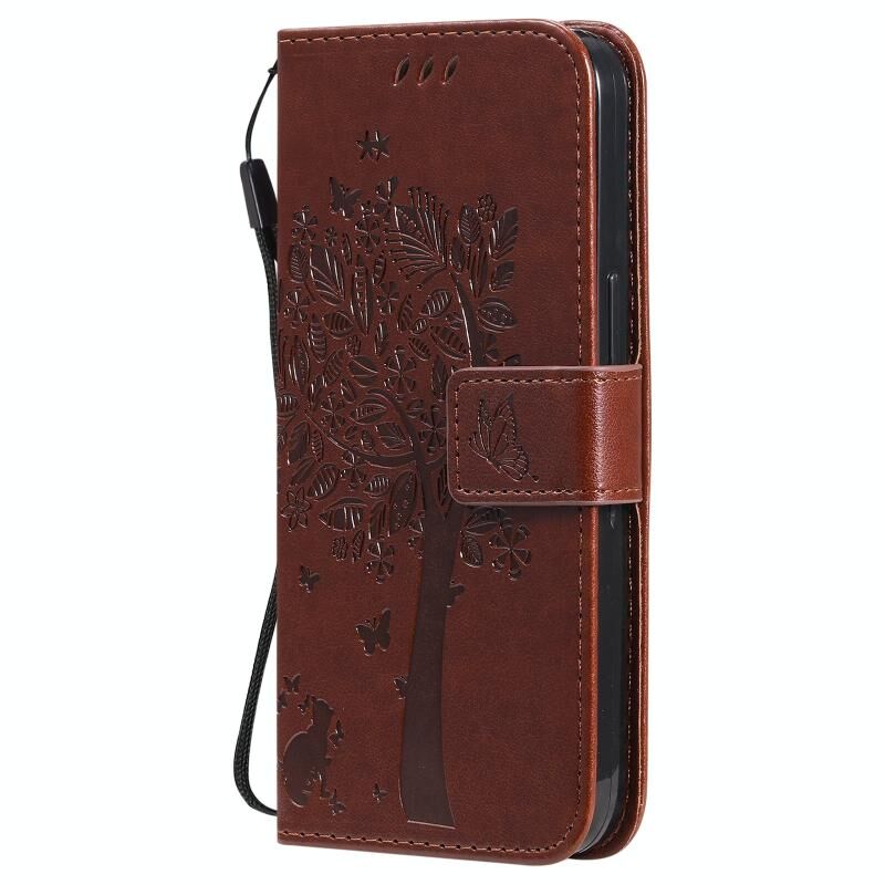 For iPhone 13 Tree & Cat Pattern Pressed Printing Horizontal Flip PU Leather Case with Holder & Card Slots & Wallet & Lanyard(Brown)