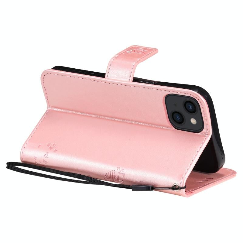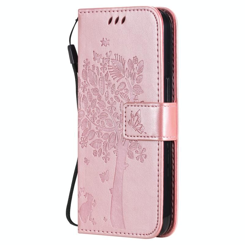 For iPhone 13 Tree & Cat Pattern Pressed Printing Horizontal Flip PU Leather Case with Holder & Card Slots & Wallet & Lanyard(Rose Gold)