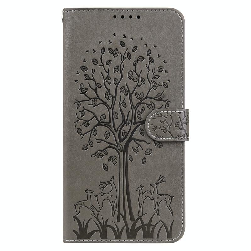 For iPhone 13 Tree & Deer Pattern Pressed Printing Horizontal Flip Leather Phone Case(Grey)