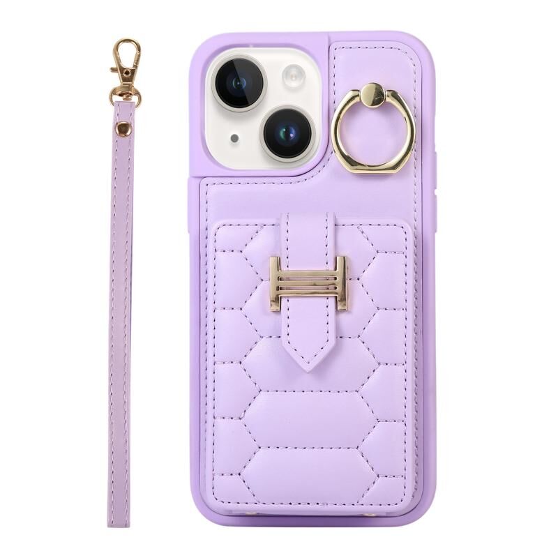 For iPhone 13 Vertical Card Bag Ring Holder Phone Case with Dual Lanyard(Purple)