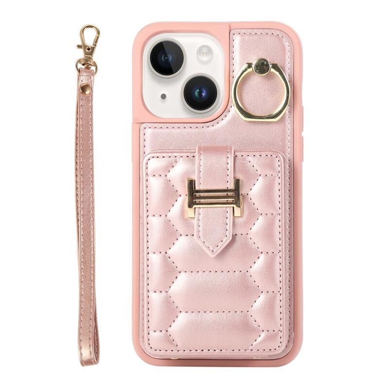 For iPhone 13 Vertical Card Bag Ring Holder Phone Case with Dual Lanyard(Rose Gold)