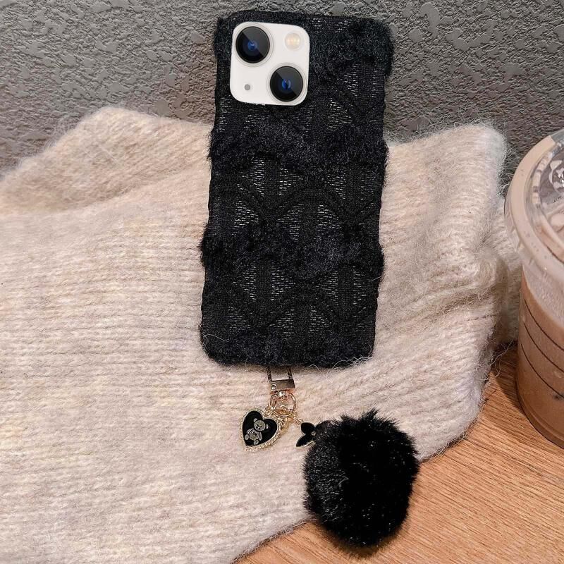 Θήκη κινητού τηλεφώνου για iPhone 13 με υφή W, βελούδινη PU υβριδική PC με μπρελόκ κούκλας (Μαύρο)