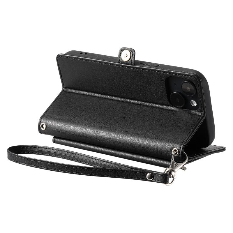 For iPhone 13 Wallet Multi-card Slot Leather Phone Case with Lanyard(Black)