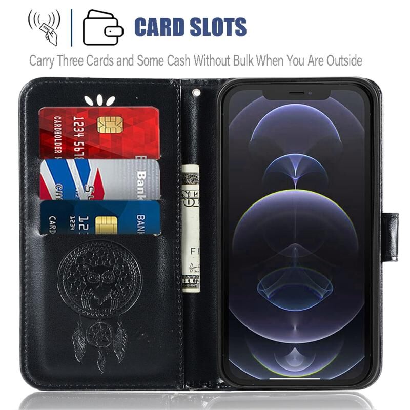 Θήκη για iPhone 13, δερμάτινη οριζόντια με φλις, σχέδιο κουκουβάγιας με αερόφωνο, με βάση & θήκες για κάρτες & πορτοφόλι (Μαύρο)