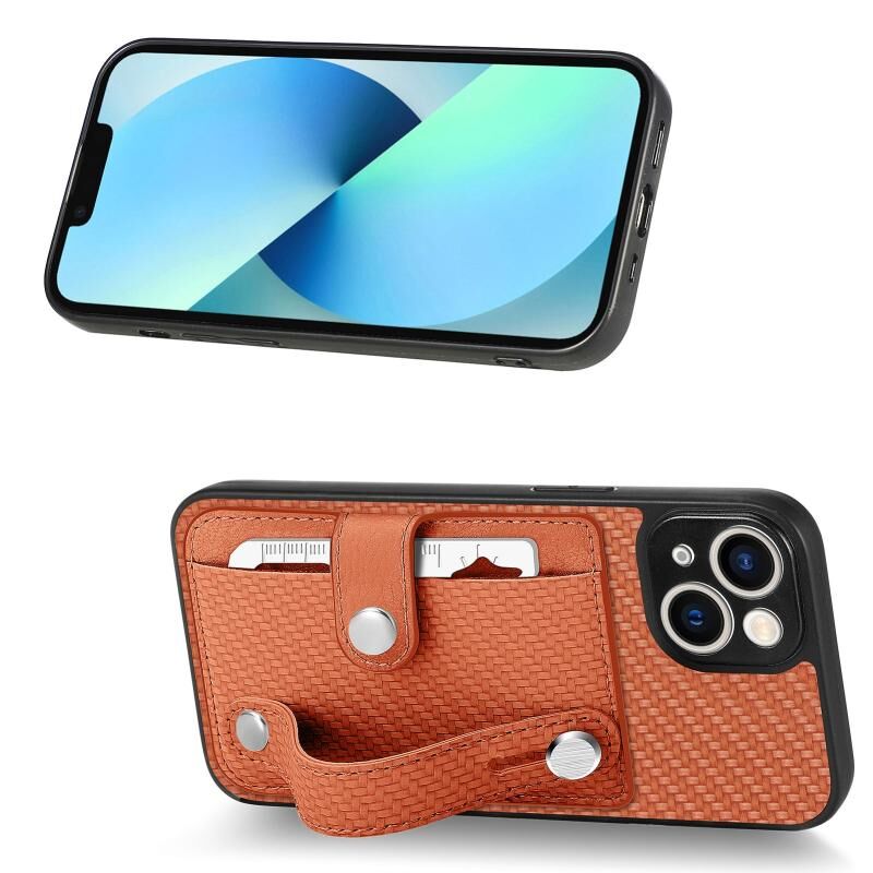 For iPhone 13 Wristband Kickstand Card Wallet Back Cover Phone Case with Tool Knife(Brown)