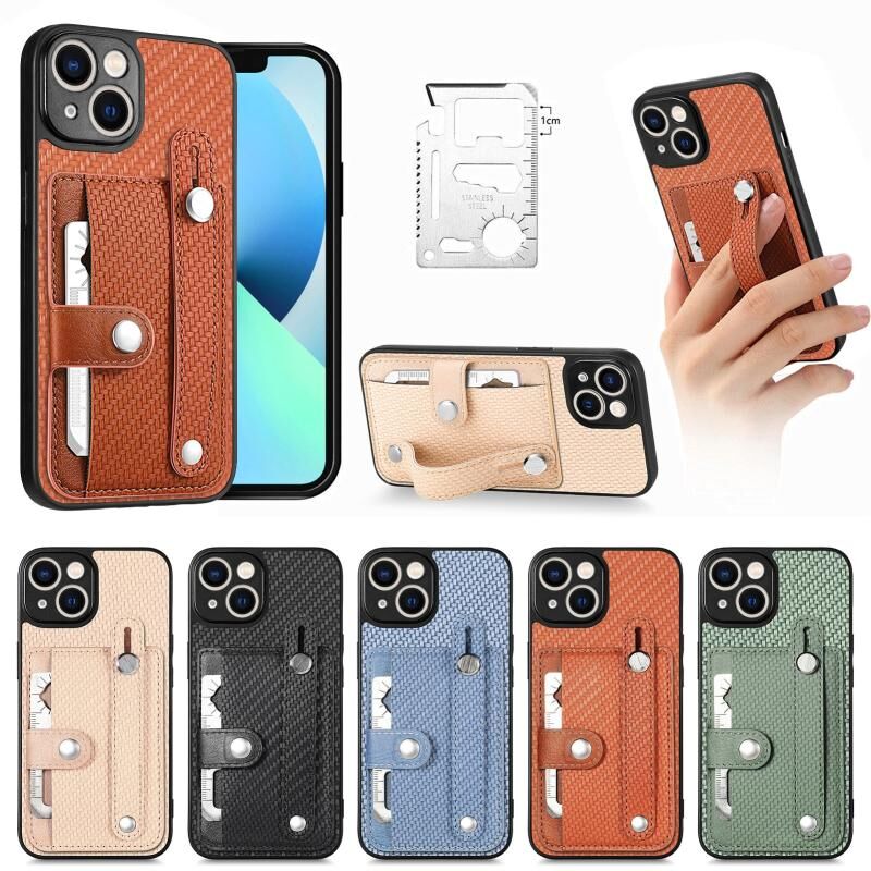 For iPhone 13 Wristband Kickstand Card Wallet Back Cover Phone Case with Tool Knife(Khaki)