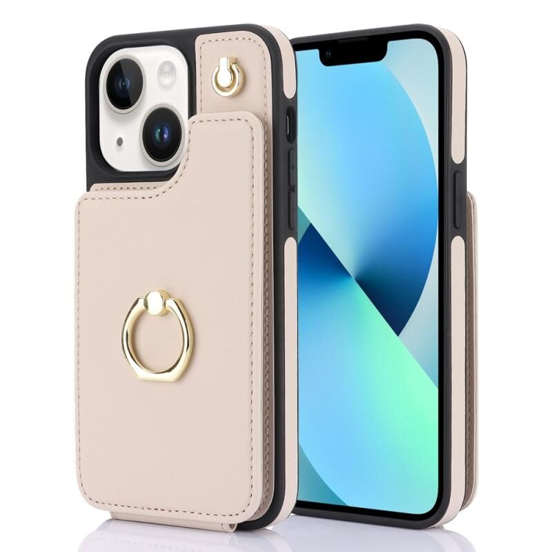 For iPhone 13 YM005 Skin Feel Card Bag Phone Case with Long Lanyard(Apricot)