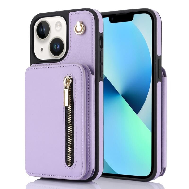 Θήκη κινητού τηλεφώνου για iPhone 13 YM006 με αίσθηση δέρματος, φερμουάρ και τσέπη για κάρτες, με διπλό κορδόνι (βαθύ μωβ)