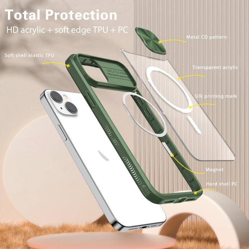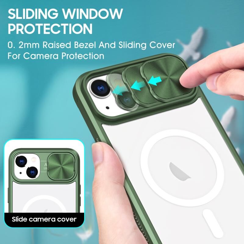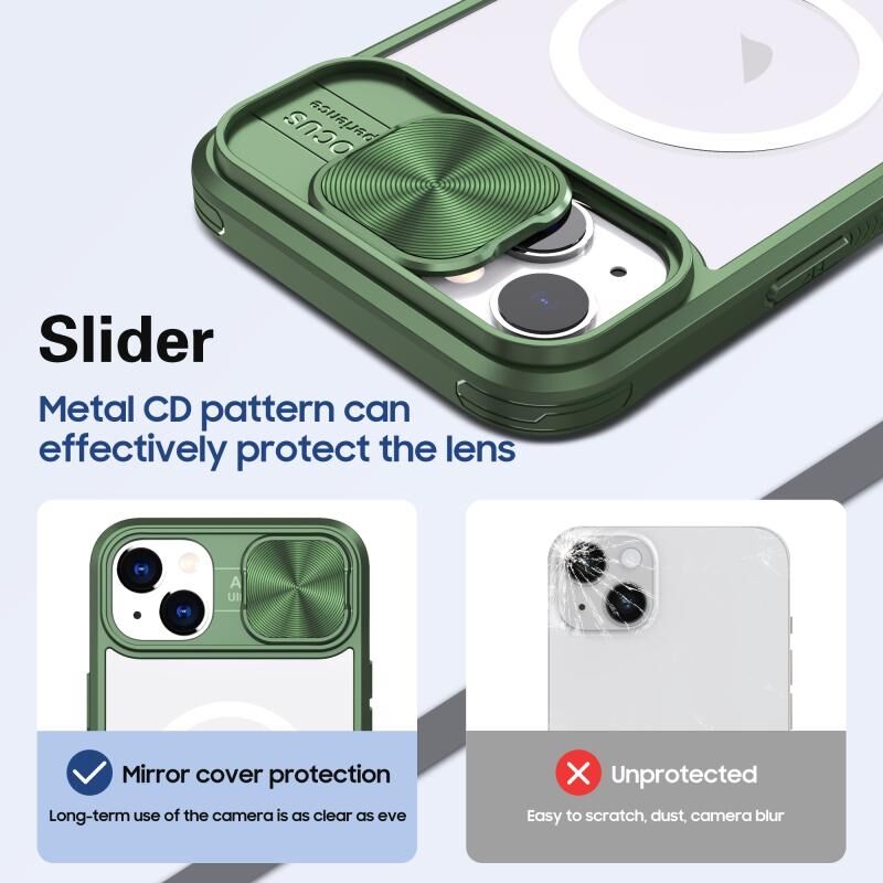 Θήκη κινητού τηλεφώνου πλήρους κάλυψης με συρόμενο κάλυμμα φακού MagSafe για iPhone 14 / 13 από ακρυλικό + PC + TPU (Χακί Πράσινο)