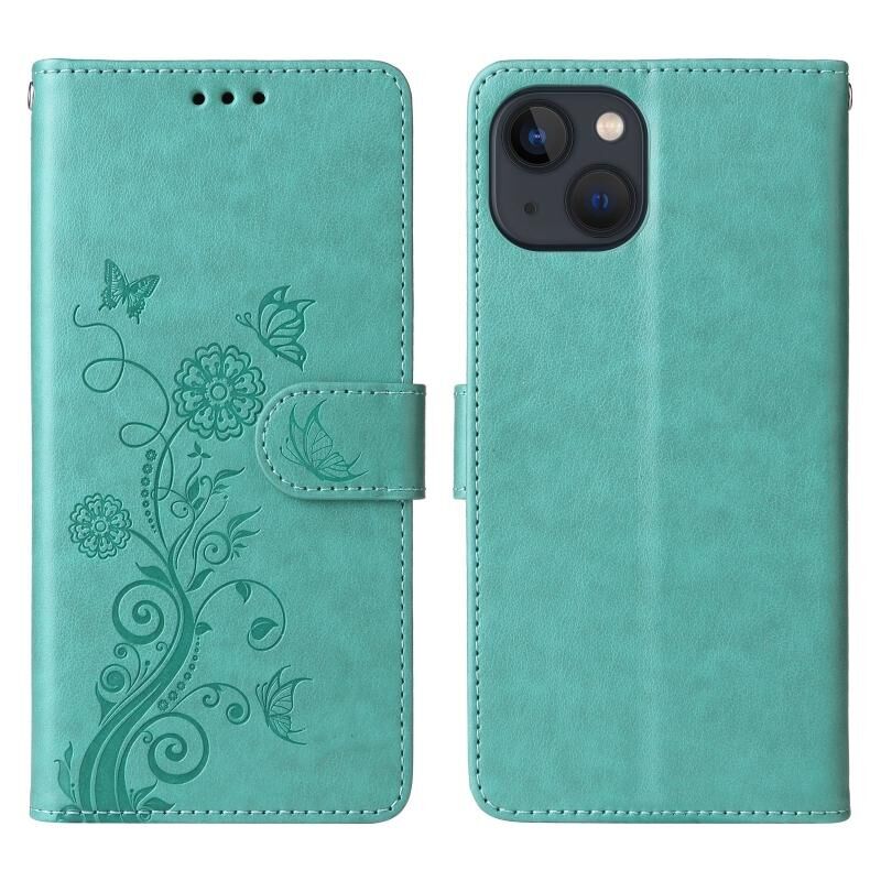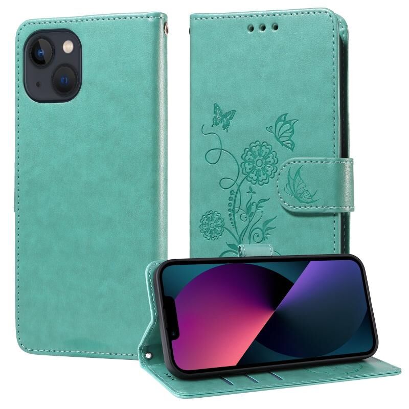 For iPhone 14 / 13 Embossed Butterfly Flowers Leather Phone Case(Green)