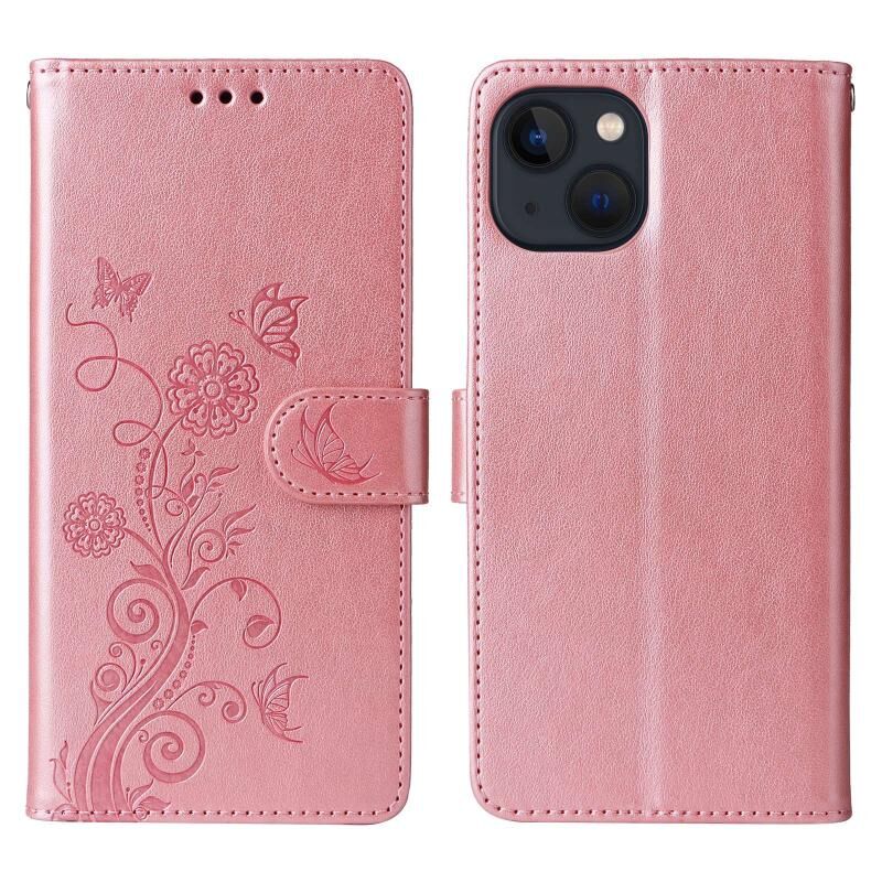 For iPhone 14 / 13 Embossed Butterfly Flowers Leather Phone Case(Rose Gold)