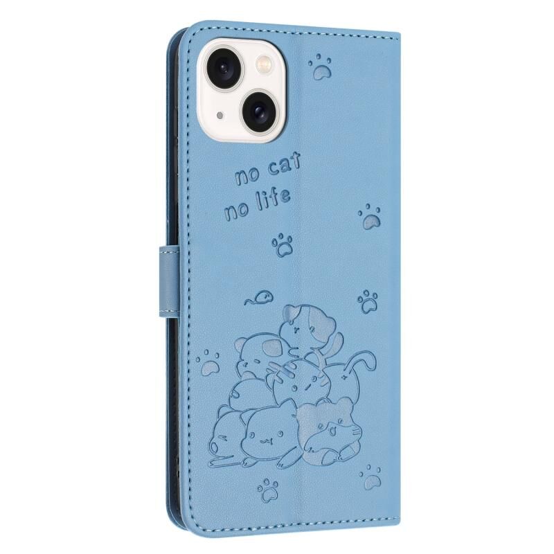 Θήκη δέρματος για iPhone 14 / 13 με ανάγλυφο γατάκι και κορδόνι (Μπλε)