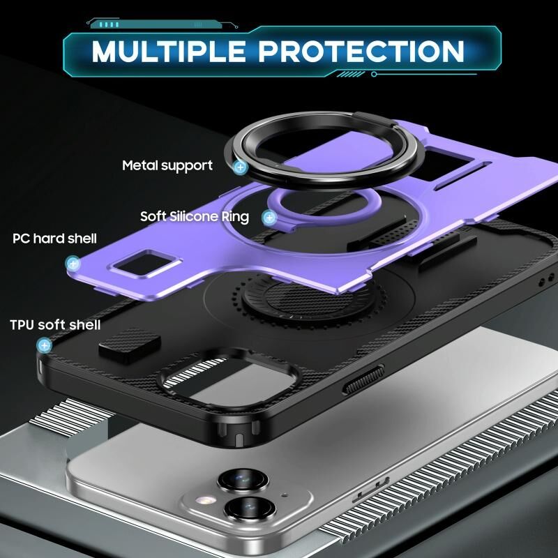 3. Δακτύλιος Σιλικόνης και Βάση: Δεν παρέχει μόνο βασική προστασία, αλλά η θήκη λειτουργεί και ως λαβή για να κρατάτε σταθερά το τηλέφωνό σας. Και ως βάση τηλεφώνου που επιτρέπει την κατακόρυφη ή οριζόντια λειτουργία σε πολλαπλές γωνίες.