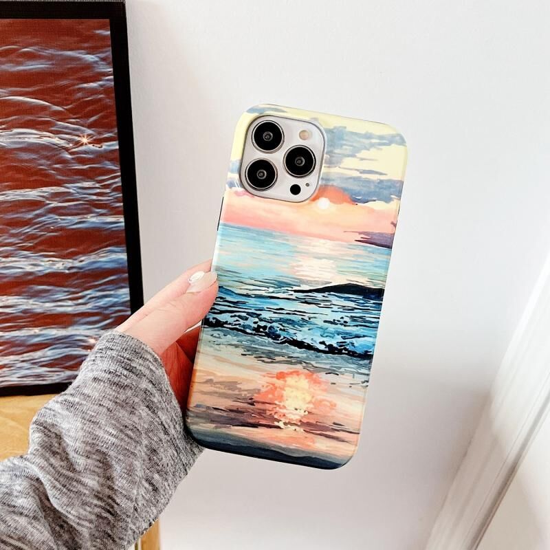 For iPhone 14 2 in 1 Detachable Oil Painting Sea Pattern Phone Case(Yellow Pink)