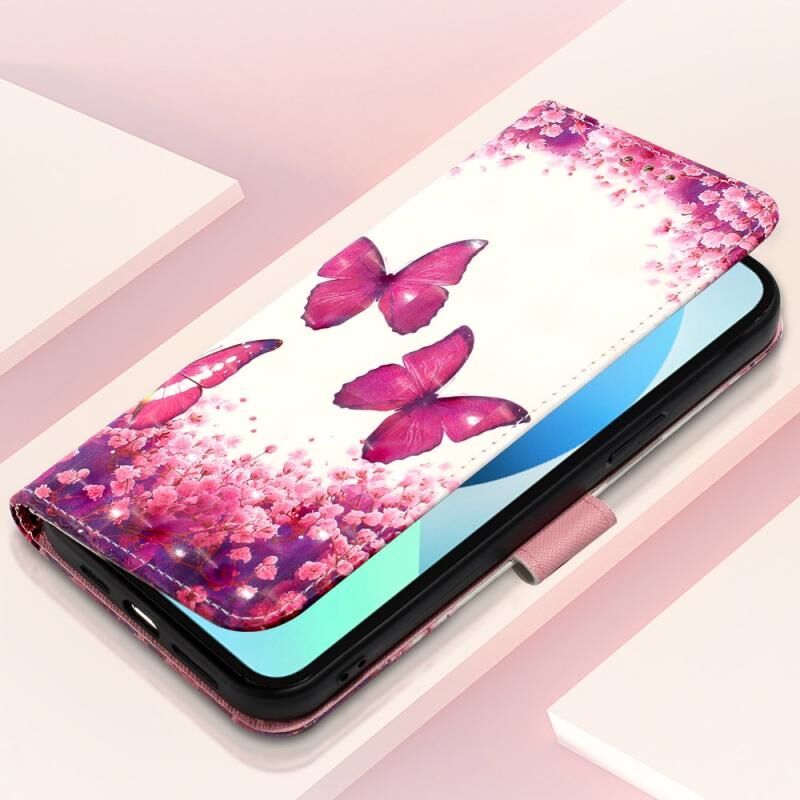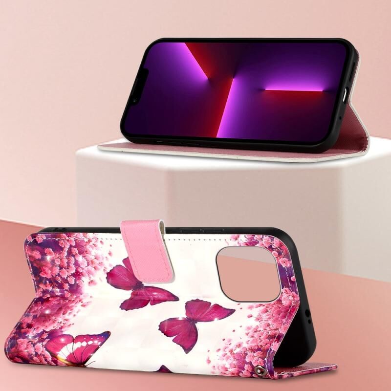 Θήκη τηλεφώνου δερμάτινη με οριζόντιο άνοιγμα και 3D ζωγραφική για iPhone 14 (Ροζ Πεταλούδα)