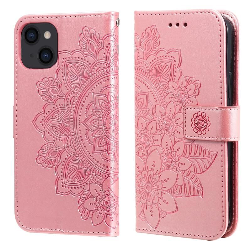 Θήκη δέρματος με ανάγλυφα 7 πέταλα λουλουδιών για iPhone 14 (Χρυσό Ροζ)