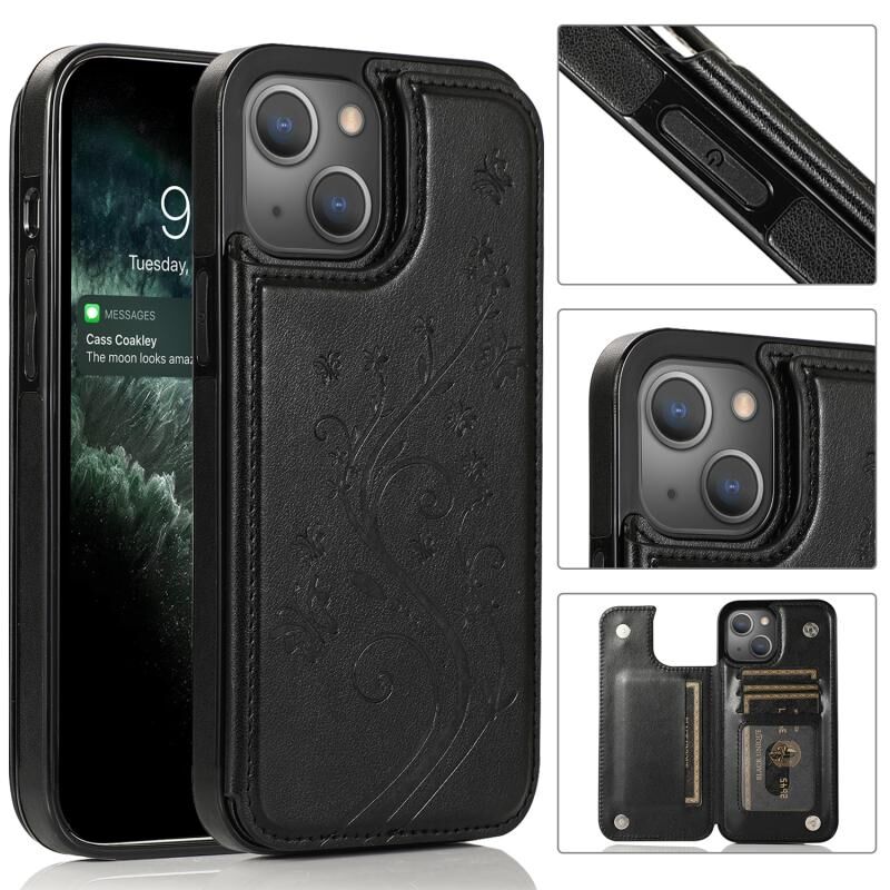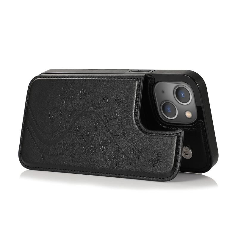 Θήκη για iPhone 14 με Πεταλούδες, Λουλούδια και Διπλή Αγκράφα (Μαύρο)