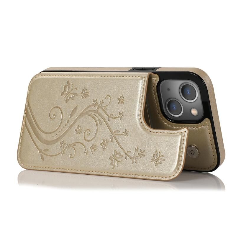 Θήκη για iPhone 14 με Πεταλούδες, Λουλούδια και Διπλή Αγκράφα (Μαύρο)