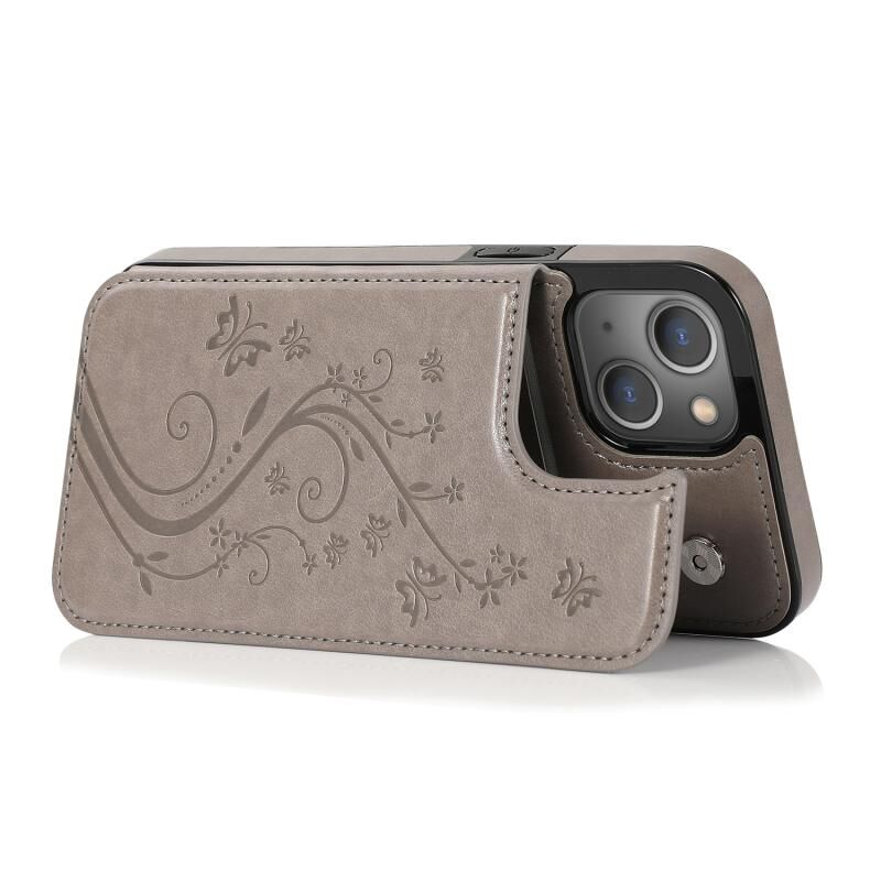 Θήκη για iPhone 14 με Πεταλούδες, Λουλούδια και Διπλή Αγκράφα (Μαύρο)