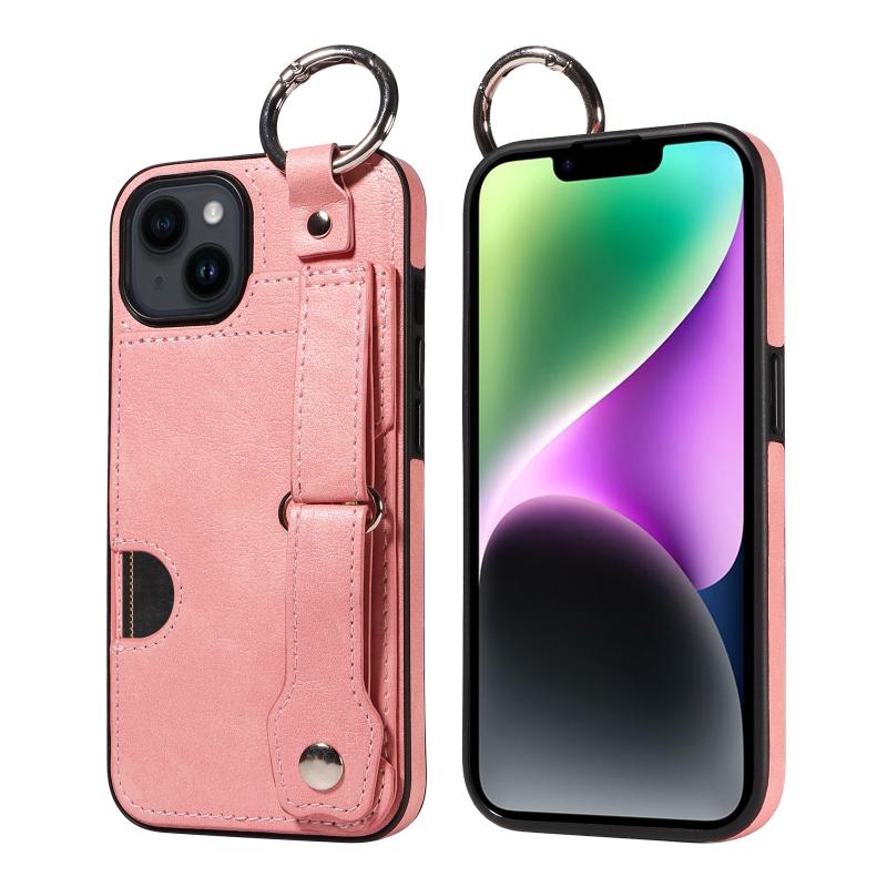 For iPhone 14 Calf Texture Wrist Card Slot Ring Phone Case(Pink)