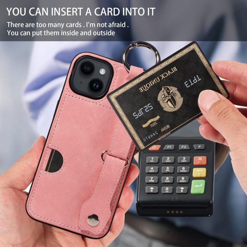 Θήκη τηλεφώνου για iPhone 14 με υφή μοσχαρίσιου δέρματος, υποδοχή κάρτας καρπού και δακτύλιο (Ροζ)