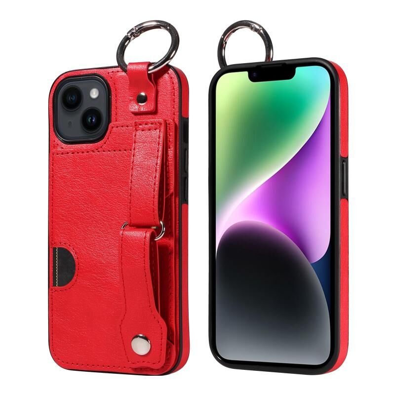 Θήκη τηλεφώνου για iPhone 14 με υφή μοσχαρίσιου δέρματος, υποδοχή κάρτας καρπού και δακτύλιο (Ροζ)