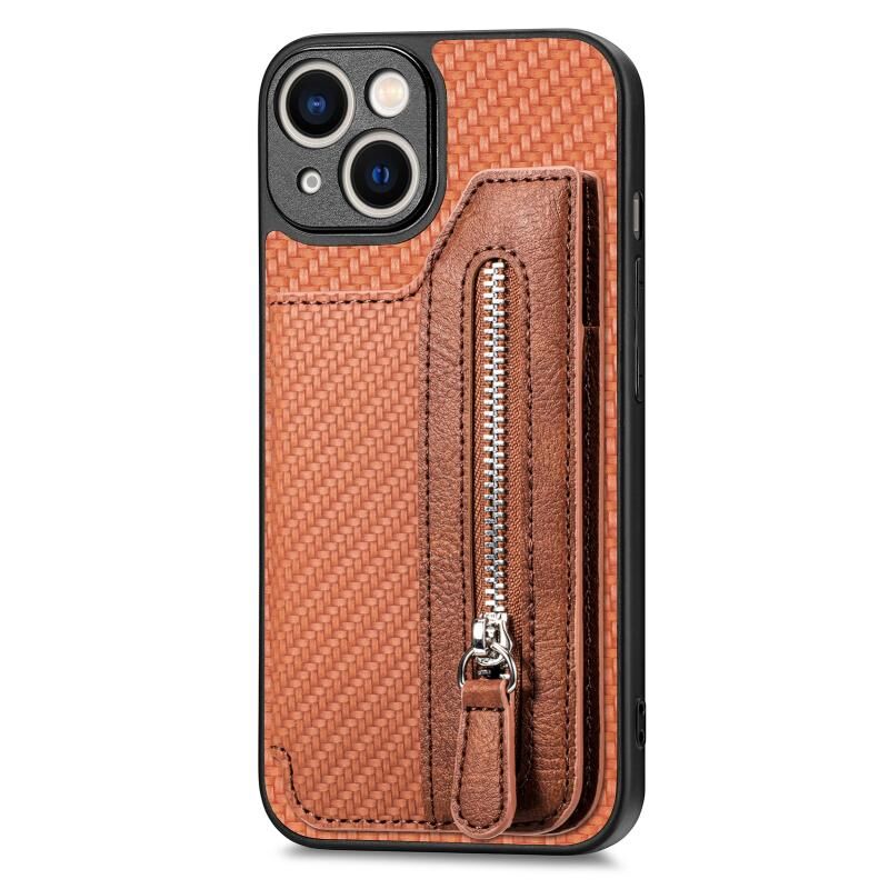 For iPhone 14 Carbon Fiber Horizontal Flip Zipper Wallet Phone Case(Brown)