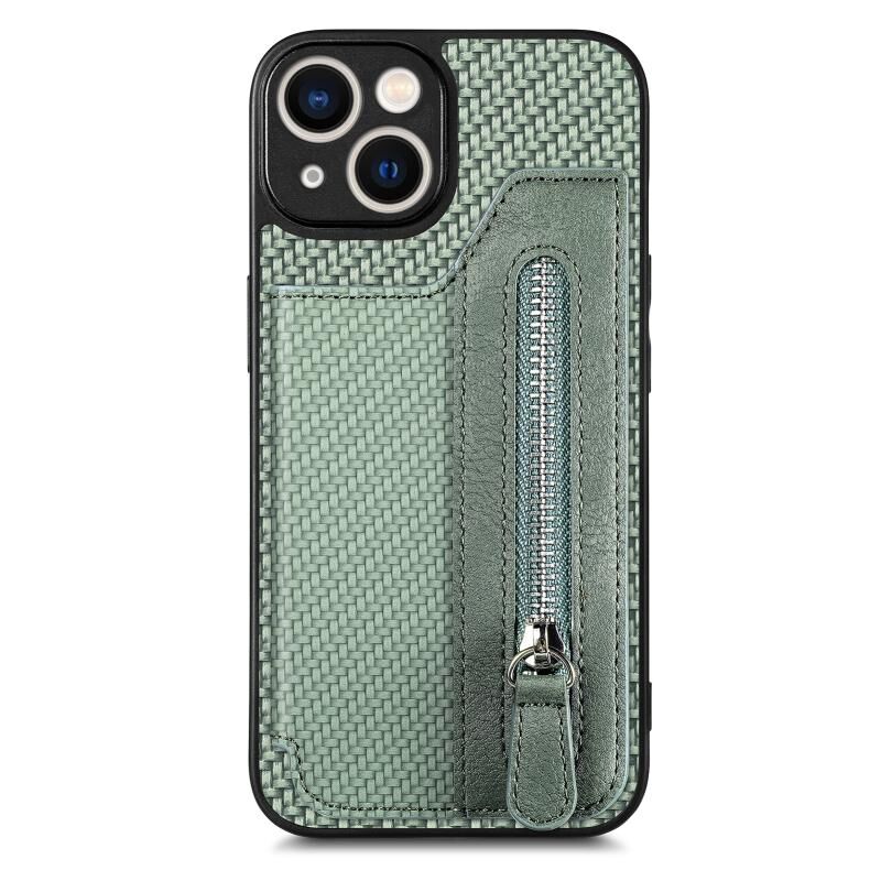 For iPhone 14 Carbon Fiber Horizontal Flip Zipper Wallet Phone Case(Green)