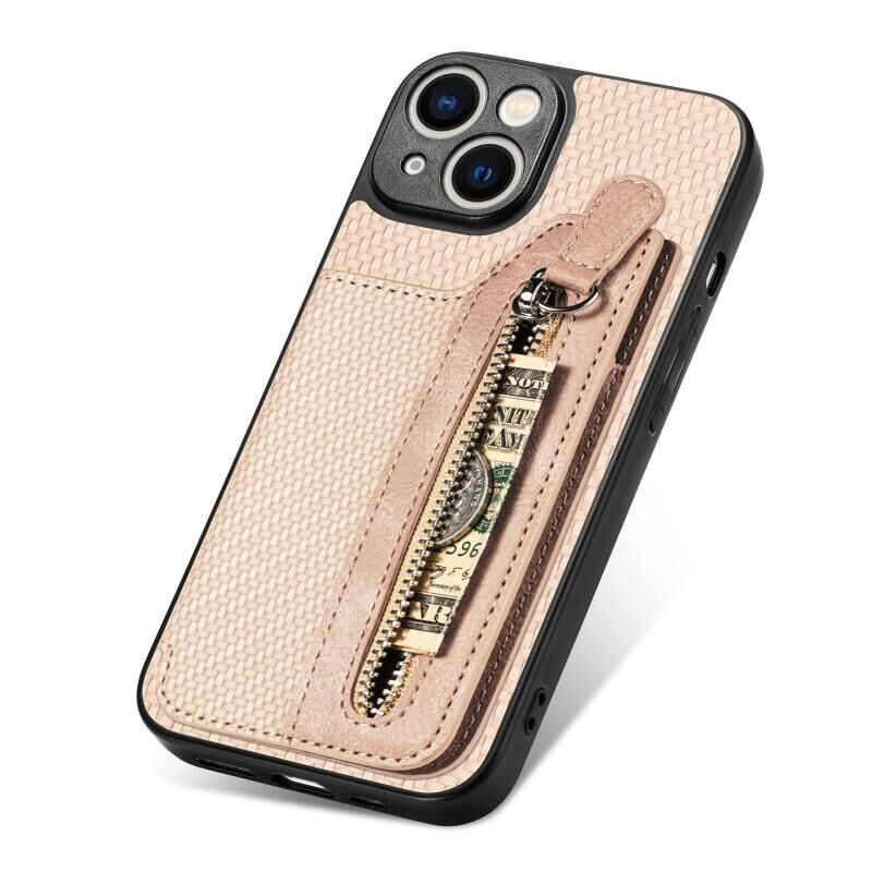 For iPhone 14 Carbon Fiber Horizontal Flip Zipper Wallet Phone Case(Khaki)