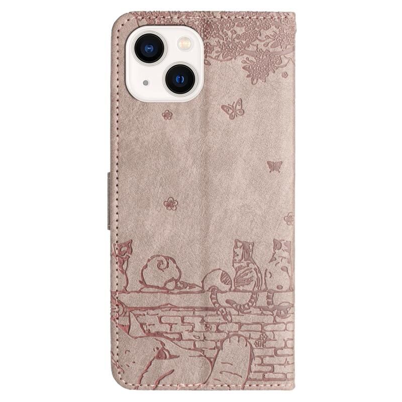 For iPhone 14 Cat Embossing Pattern Leather Phone Case with Lanyard(Grey)