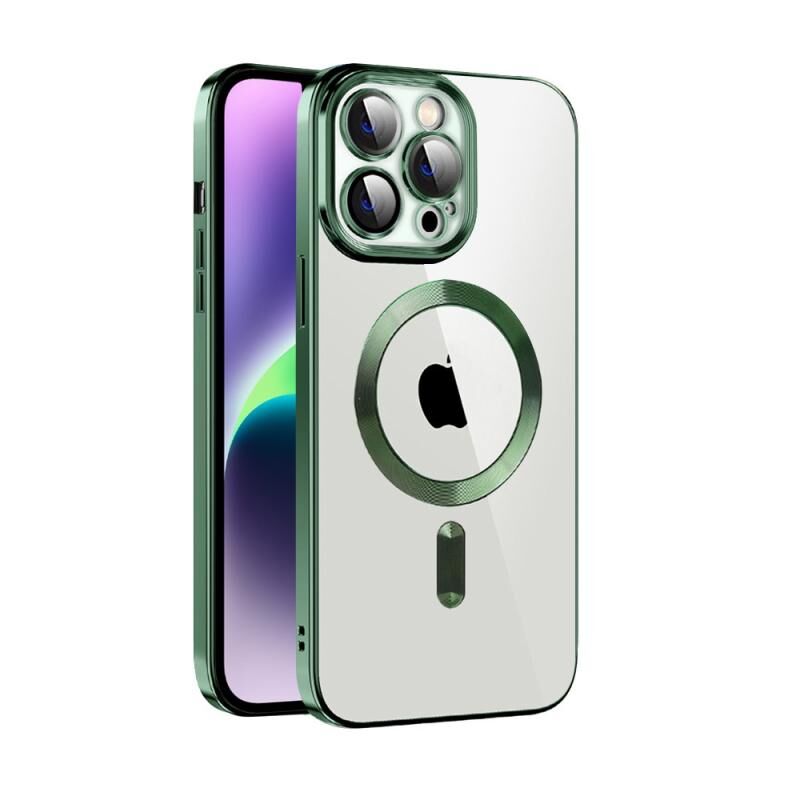 For iPhone 14 CD Texture Plating TPU MagSafe Phone Case with Lens Film(Dark Green)