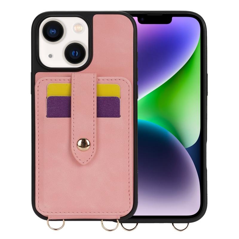 For iPhone 14 Crossbody Skin Card Bag Lanyard Phone Case(Pink)