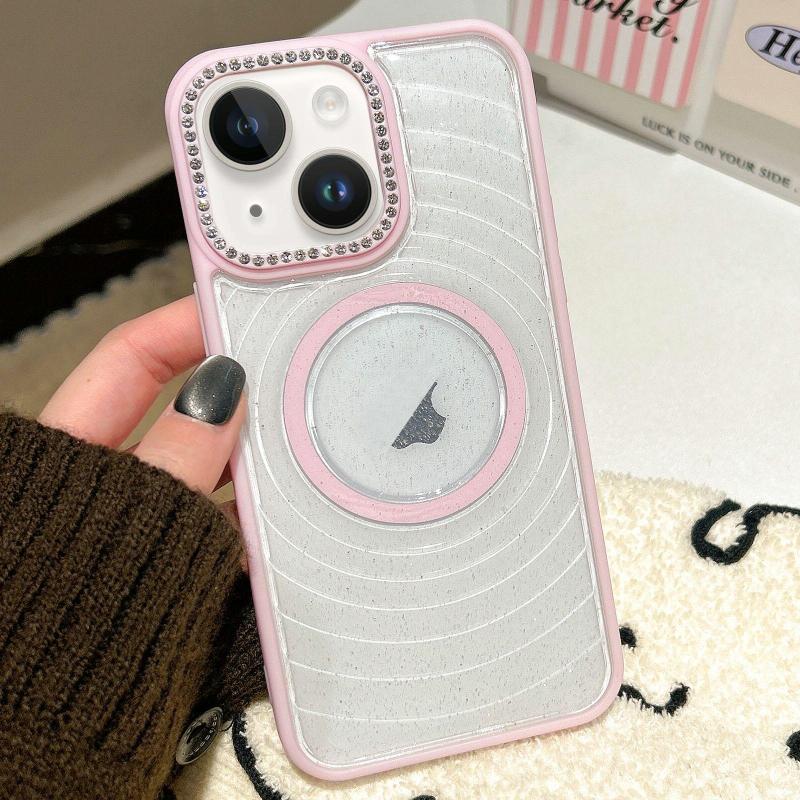 For iPhone 14 Diamond Lens Frame MagSafe Wave Texture Clear Phone Case(Pink)