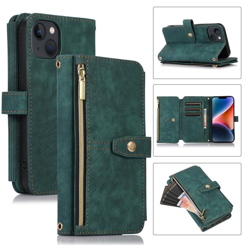 Θήκη κινητού τηλεφώνου από δέρμα για iPhone 14 Dream, με τσέπη πορτοφολιού για 9 κάρτες και φερμουάρ (Κόκκινο)