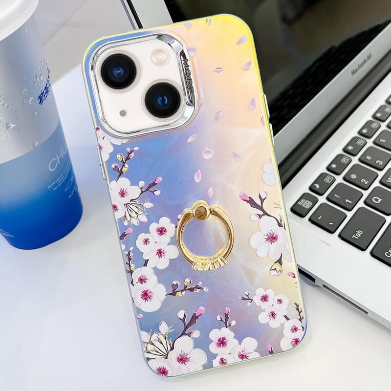 Θήκη τηλεφώνου TPU με δακτύλιο στήριξης και λουλουδάτο σχέδιο με ηλεκτρολυτική επίστρωση λέιζερ για iPhone 14 (Δαμασκηνιά AH18)