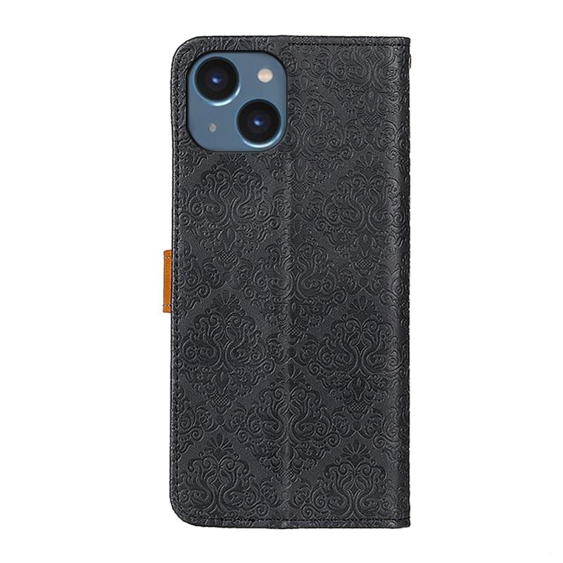 For iPhone 14 European Floral Embossed Copper Buckle Horizontal Flip PU Leather Phone Case (Black)