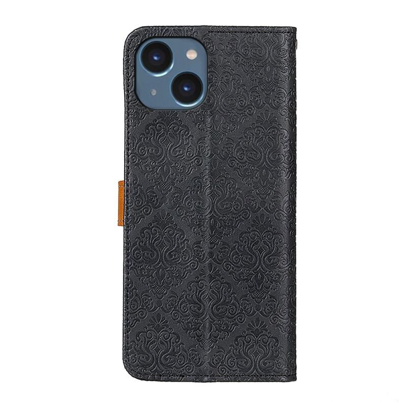 Θήκη τηλεφώνου οριζόντιας αναδίπλωσης από δερματίνη PU με ανάγλυφο ευρωπαϊκό floral σχέδιο και αγκράφα από χαλκό για iPhone 14 (Μαύρο)