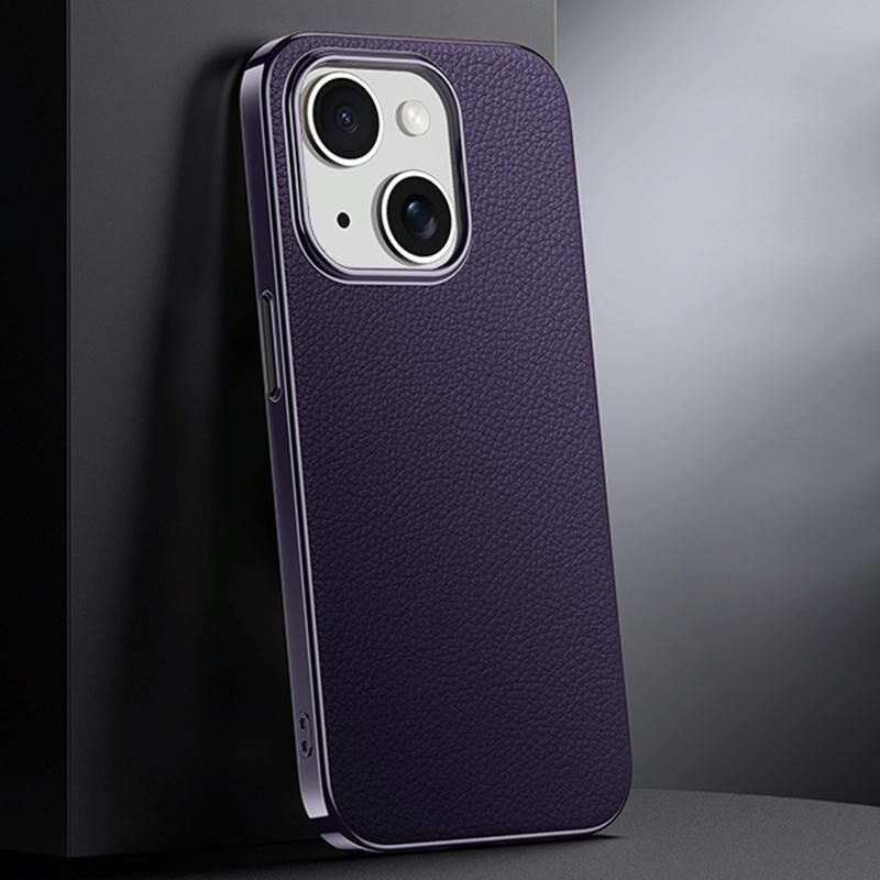 Θήκη τηλεφώνου για iPhone 14, πρώτης στρώσης δέρμα αγελάδας, επιμεταλλωμένο PC (βαθύ μωβ)