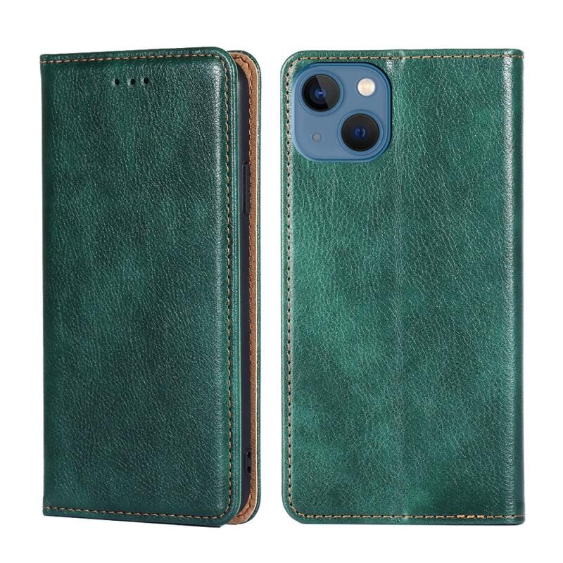 Θήκη τηλεφώνου μαγνητική από δέρμα με γυαλιστερό λάδι και συμπαγές χρώμα για iPhone 14 (Πράσινο)