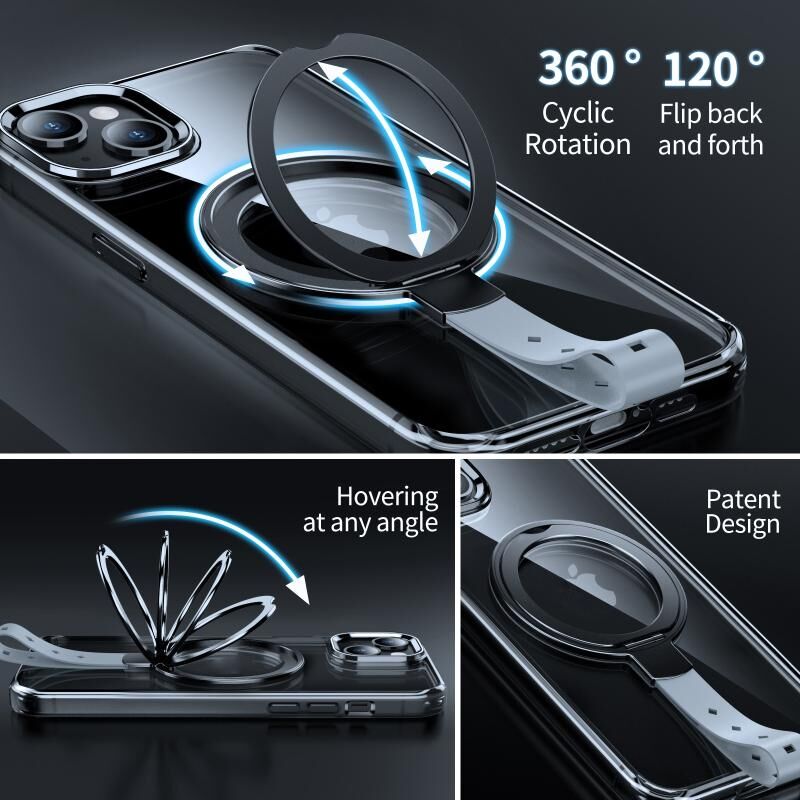 6. 360 Rotate Ring Stand: With a compact and practical design, we seamlessly combine powerful MagSafe tech with a foldable stand. The built-in kickstand effortlessly rotates 360 degrees and folds 120 degrees, giving you the ideal viewing angle for both landscape and portrait orientations. When folded, it seamlessly aligns with the back of the case, maintaining a slim profile for easy pocket-sliding.