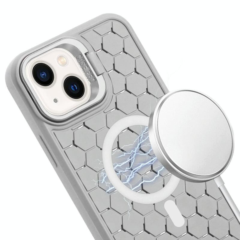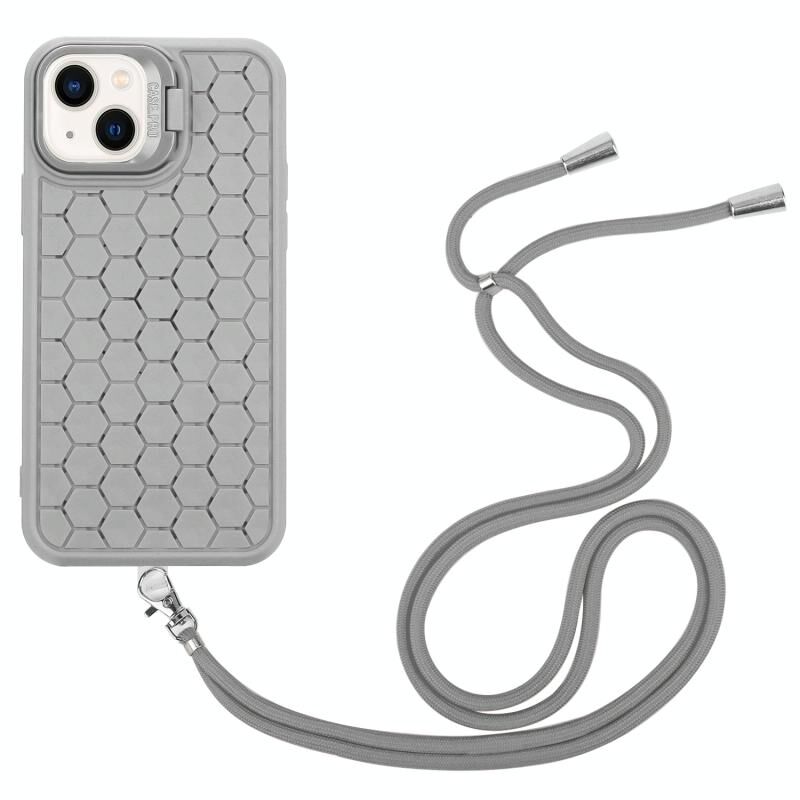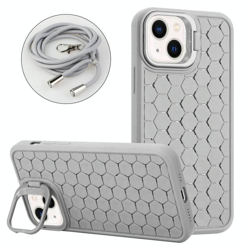 For iPhone 14 Honeycomb Radiating Lens Holder Magsafe Phone Case with Lanyard(Grey)