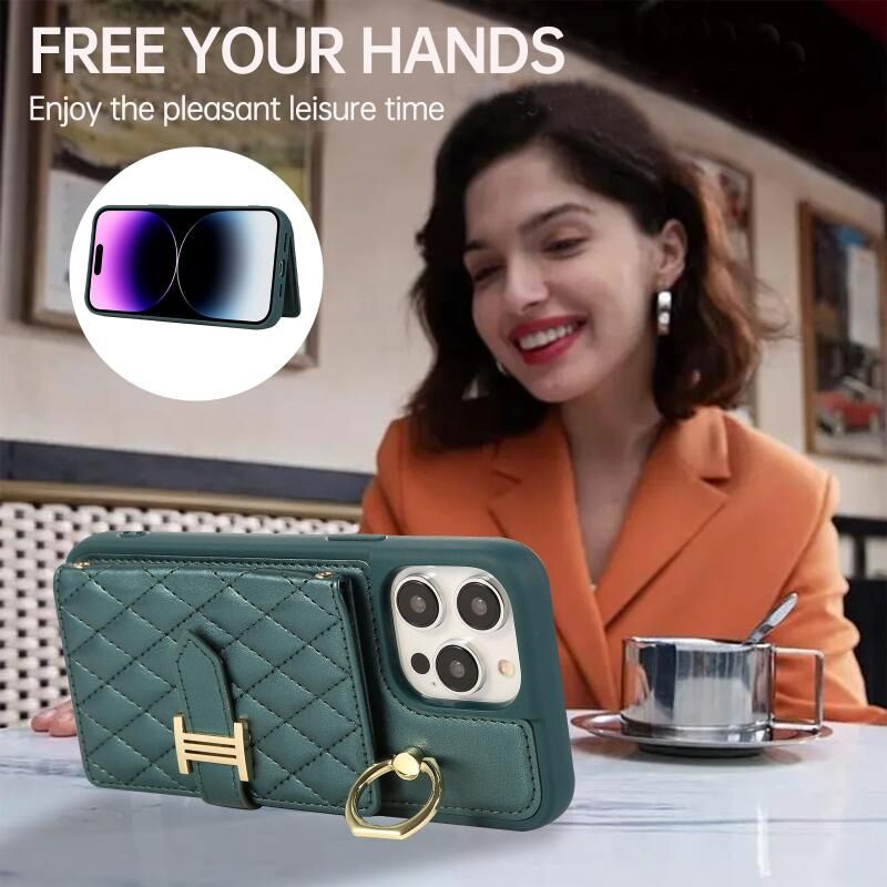 Θήκη τηλεφώνου για iPhone 14 με οριζόντια τσέπη για κάρτες, δακτύλιο στήριξης και διπλό κορδόνι (Σκούρο Μωβ)