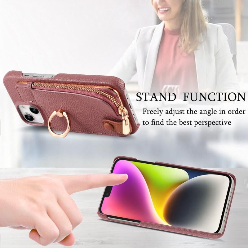 Θήκη κινητού τηλεφώνου για iPhone 14, δερμάτινη Litchi με λεπτές άκρες, δακτύλιος και φερμουάρ (Χρώμα: Βερίκοκο Jujube)